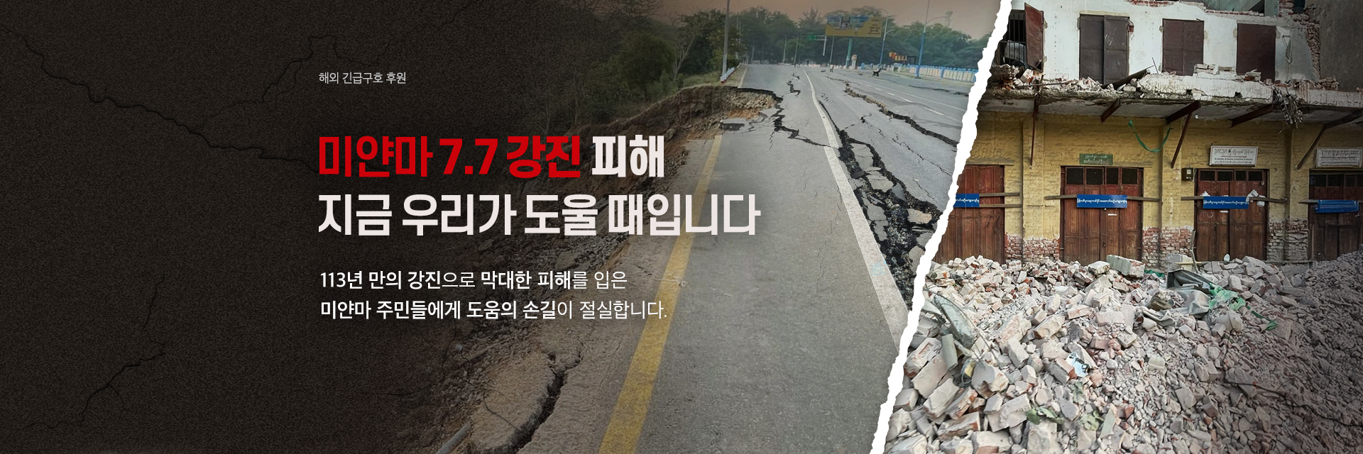 2025년 3월 28일, 현지시간 12시 50분경 미얀마의 대도시 만달레이 지역 인근에서 규모 7.7의 강진이 발생했습니다. 예고 없이 발생한 강진은 미얀마를 더욱 깊은 절망으로 몰아넣고 있습니다. 도시는 잿더미로 변했고, 도로는 갈라져 이동조차 쉽지 않습니다. 가족을 잃은 이들은 슬픔에 잠겼고, 부상을 당한 사람들은 의료 지원이 부족한 환경에서 고통받고 있습니다.