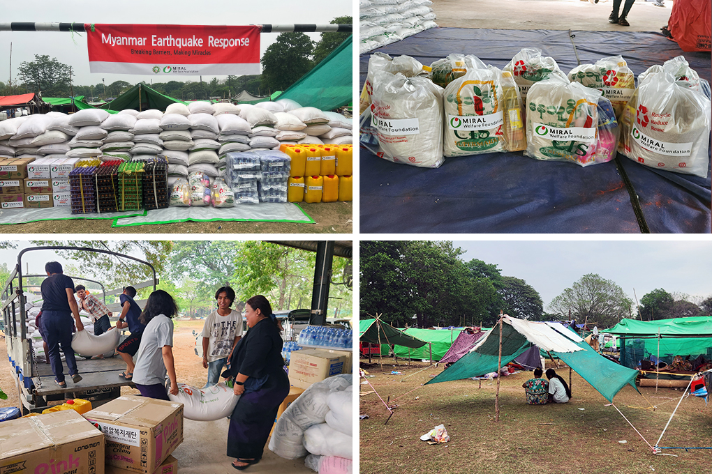 밀알복지재단은 강진 피해 지역 중 하나인 만달레이 아마라푸라에서 현지 협력기관과 함께 긴급 구호 키트를 전달하고 있습니다. 구호 키트에는 즉각적인 생존을 위한 통조림, 긴급 식량과 깨끗한 식수, 소독용 알코올, 비누 같은 위생용품 및 담요, 모기장 등을 포함한 기본적인 생필품이 포함됩니다.