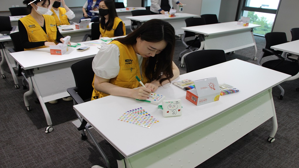 [태양광랜턴 조립 후 꾸미기 중인 한국남동발전 분당발전본부 임직원]