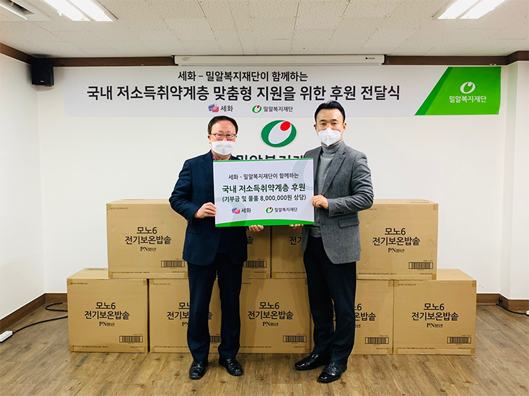 지난 2020년 12월! 밀알복지재단에서는 판촉물 및 상품종합 전문기업 '세화'와 기부금품 전달식을 진행했습니다. 상품 전문 유통기업에 걸맞게 세화에서는 올 연말 코로나 19와 한파로 생활에 어려움을 겪는 소외이웃을 위해 소중한 기부금과 물품을 기부해주셨습니다. 저소득 취약계층 대상자가 겪는 각기 다른 어려움에 맞춰 지원될 수 있도록 4,000,000원 기부약정과 함께, 노인복지시설 지원을 위한 전기밥솥 40여개를 후원해 주셨습니다.