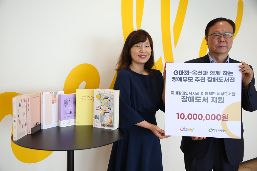 6/2(수) 아주 특별한 전달식이 진행되었습니다. 역삼동 이베이코리아 본사에서 진행된 전달식은 4/20 장애인차별 철폐의 날을 맞아 이베이코리아와 사회복지법인 밀알복지재단이 함께 장애도서전 캠페인을 진행하여 조성된 기금으로 진행되었습니다. 4월 20일부터 1달간 진행된 장애도서전 캠페인은 장애부모겸 전문가 4인이 추천하는 '장애와 병 이해를 돕는 책'을 소개하고 캠페인 기간동안 G마켓과 옥션에 판매된 책의 수량만큼 이베이코리아 회원참여형 사회공헌기금인 후원쇼핑, 나눔쇼핑에서 출연하여 기부금을 조성하였습니다. 이번 캠페인에서는 자폐, 뇌전증, 조현병, 정신질환 등 장애 및 질환 관련 도서 13권, 에세이 11권, 장애관련 동화그림책 8권 등 총 32권의 도서가 소개되었습니다. 캠페인을 통해 조성된 기금은 국내 장애인복지관 5곳에 장애도서 지원, 필리핀 세부의 파그라움 도서관에 영어 도서를 지원하는데 사용 될 예정입니다.
