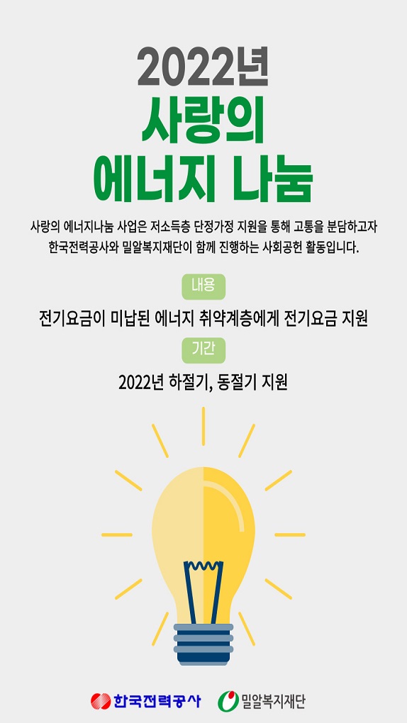 한국전력공사는 연간 약 5,000억 원의 전기요금 복지할인을 시행하고 있지만 사각지대에 있는 에너지 취약계층을 지원하기 위해 한국전력공사의 대표 사회공헌 사업인 ‘사랑의 에너지나눔’ 지원사업을2003년부터 19년째 진행하고 있습니다.