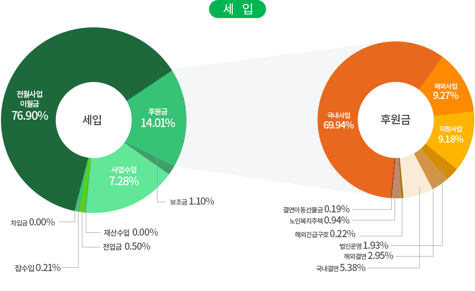 | 사업비 | 국내사업 | 국내아동결연 및 보육, 장애인의료 및 교육지원, 저소득가정 지원, 다문화가족 지원, 노인복지 사업, 지역사회복지 사업, 인식개선 사업, 발달장애인 작가양성지원 사업, 발달장애인 주간활동 서비스 |