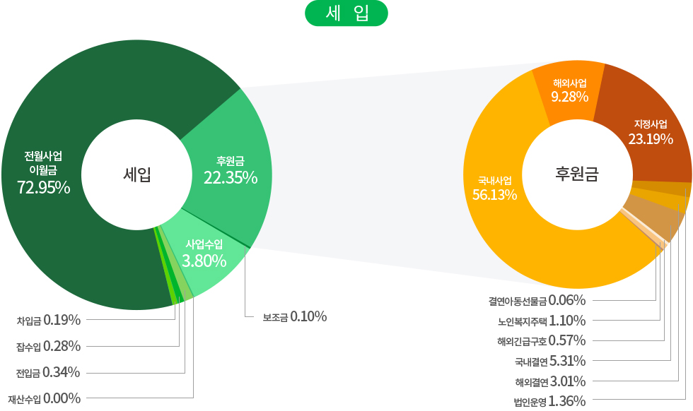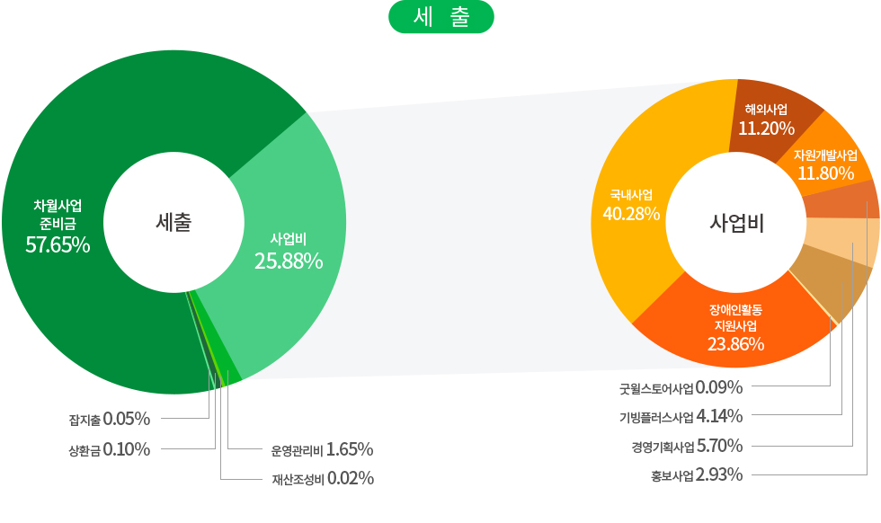 | 사업비 | 국내사업 | 국내아동결연 및 보육, 장애인의료 및 교육지원, 저소득가정지원, 다문화가족지원, 노인복지사업, 지역사회복지사업, 인식개선사업, 발달장애인주간활동서비스 |
