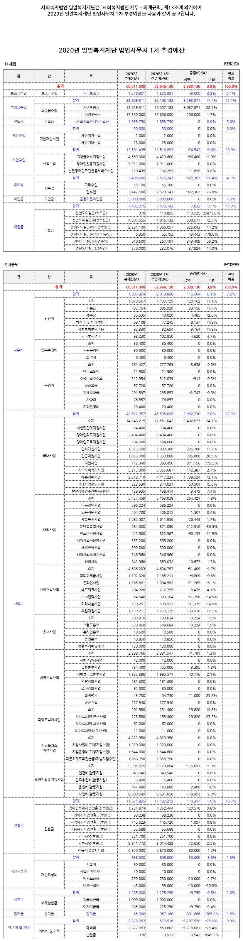2020년 밀알복지재단 법인사무처 1차 추가경정예산 공고