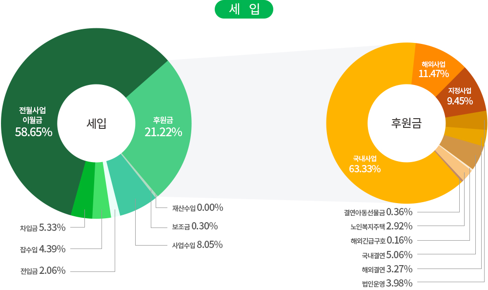 | 사업비 | 국내사업 | 국내아동결연 및 보육, 장애인의료 및 교육지원, 저소득가정지원, 다문화가족지원, 노인복지사업, 지역사회복지사업, 인식개선사업, 발달장애인주간활동서비스 |