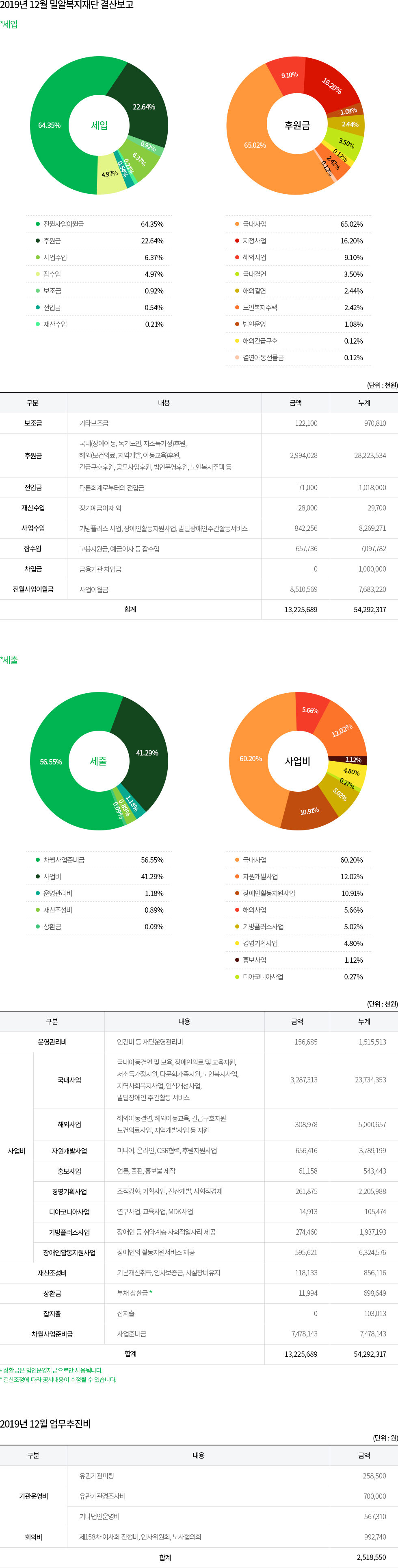 2019년 12월 밀알복지재단 법인사무처 결산보고 및 업무추진비 공개