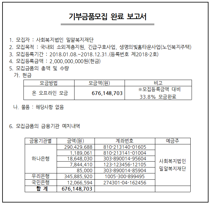 사회복지법인 밀알복지재단은 「기부금품의 모집 및 사용에 관한 법률」에 의거아래와 같이 기부금품을 모집하여 완료 보고합니다.모금된 후원금은 2019.12.31. 까지 사용됩니다.