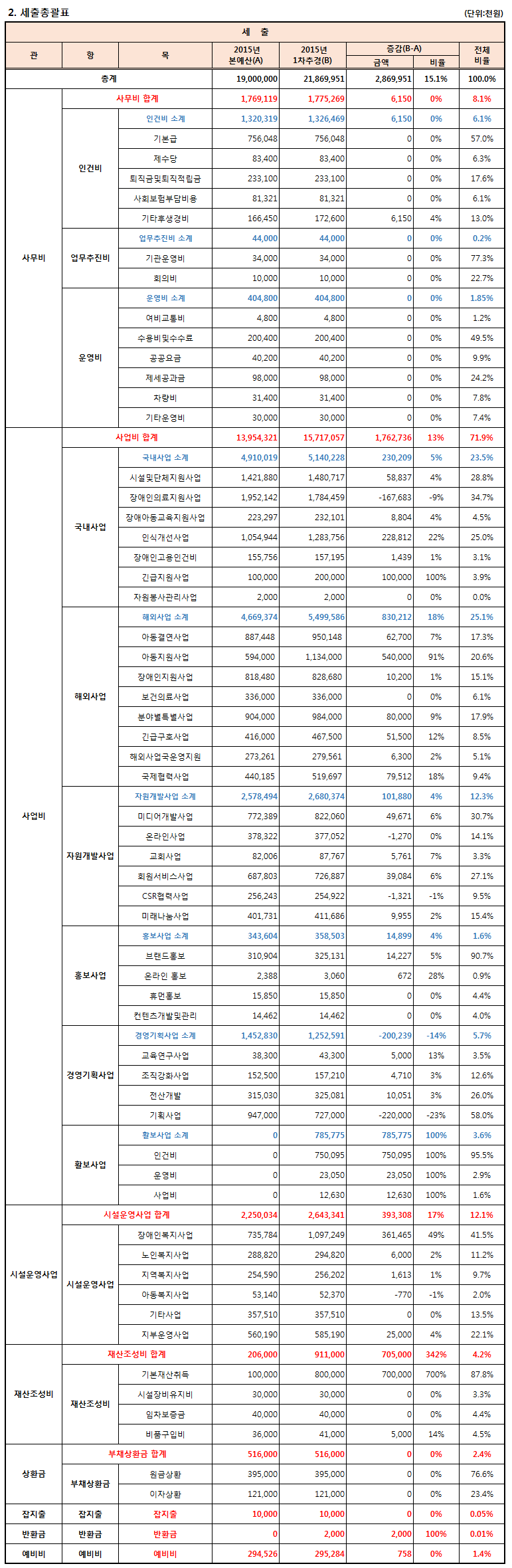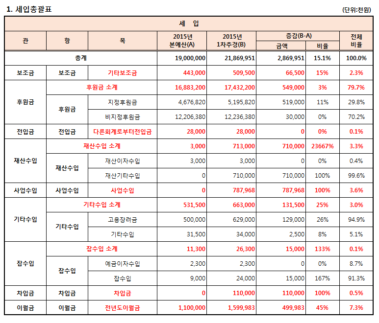 사회복지법인 재무회계규칙 제10조에 의거하여, 2015년 1차 추경예산을 아래와 같이 공고 합니다.