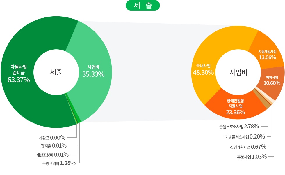 | 사업비 | 국내사업 | 국내아동결연 및 보육, 장애인의료 및 교육지원, 저소득가정 지원, 다문화가족 지원, 노인복지사업, 지역사회복지사업, 인식개선사업, 발달장애인작가양성지원사업, 발달장애인주간활동서비스, 장애인인식개선센터, 헬렌켈러지원센터 |
