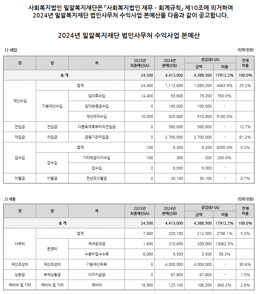 2024년 밀알복지재단 법인사무처 수익사업 본예산 공고