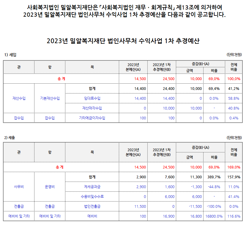 2023년 밀알복지재단 법인사무처 수익사업 1차 추가경정예산 공고