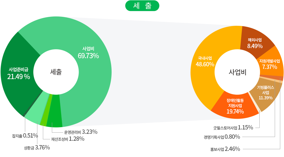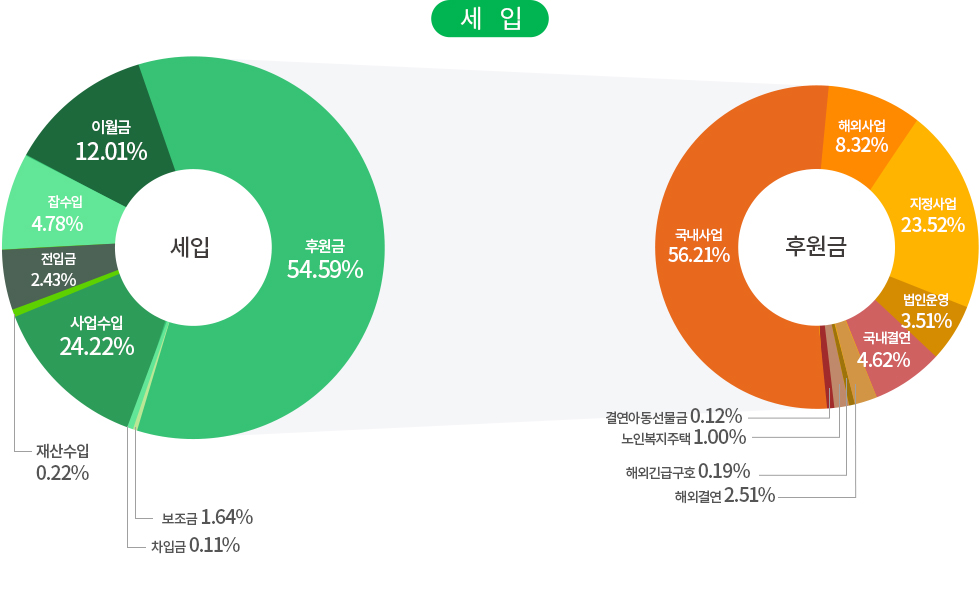 | 사업비 | 국내사업 | 국내아동결연 및 보육, 장애인의료 및 교육지원, 저소득가정지원, 다문화가족지원, 노인복지사업, 지역사회복지사업, 인식개선사업, 발달장애인작가양성지원사업, 발달장애인주간활동서비스 |