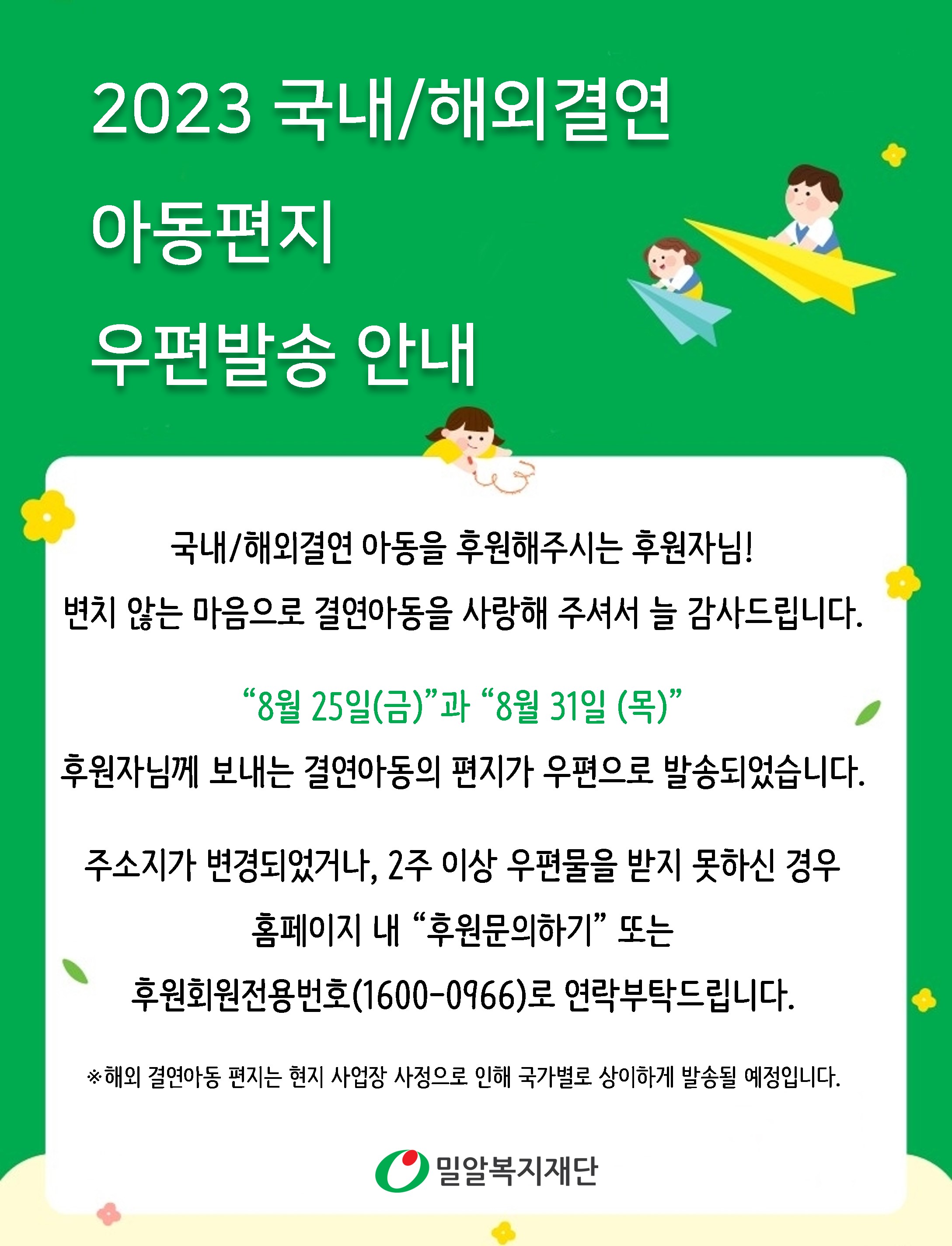 2023 국내/해외결연 아동편지 우편발송 안내