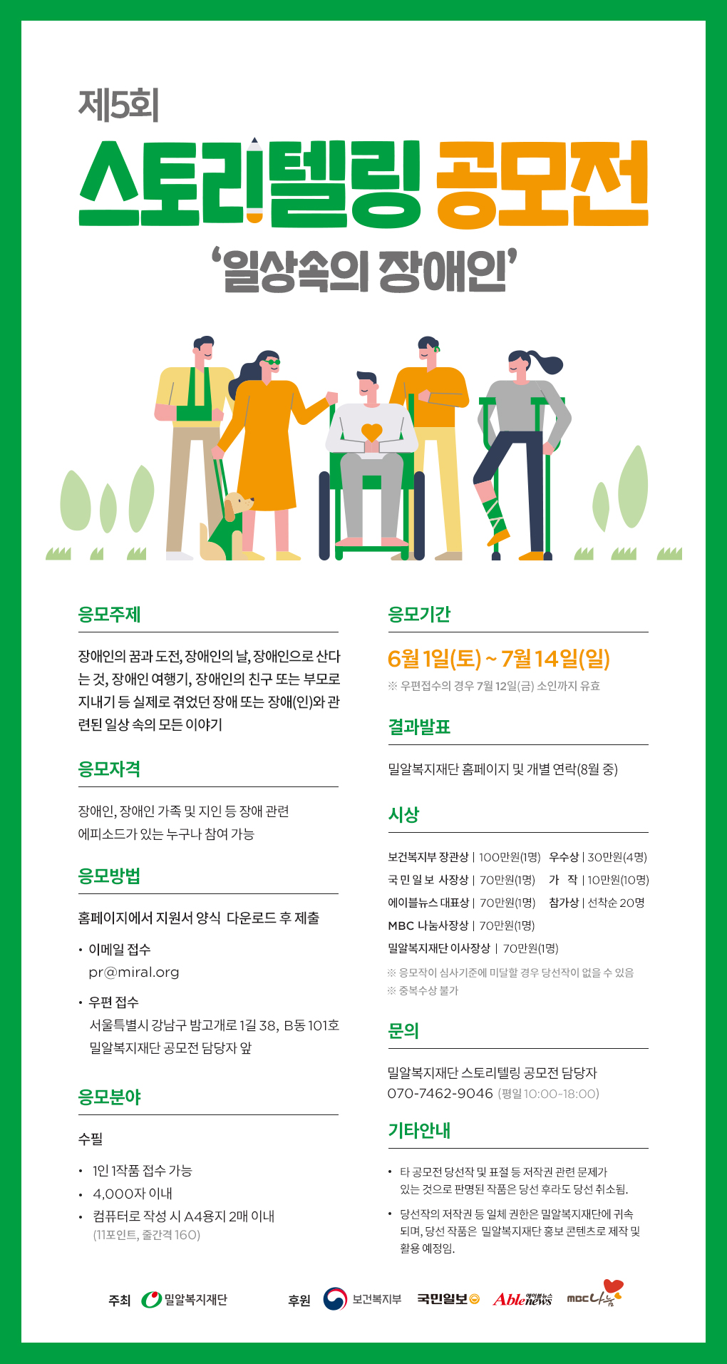 : 밀알복지재단 스토리텔링 공모전 담당자 070-7462-9046 (평일 10:00~18:00)