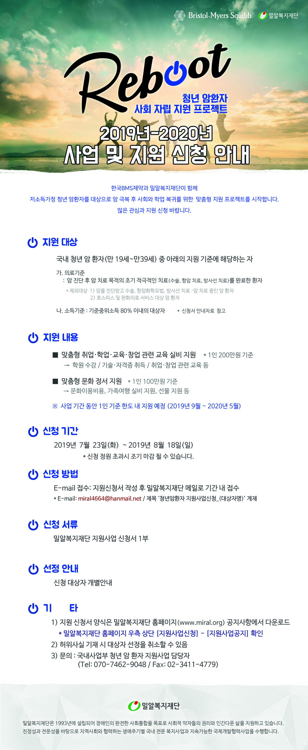 청년암환자 사회자립지원 프로젝트 "REBOOT" 지원사업 대상자 모집안내(~2019.08.18)
