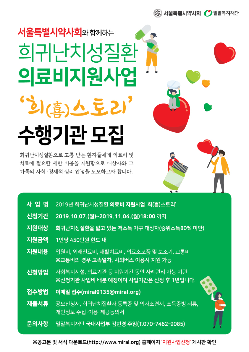 서울특별시약사회와 함께하는 희귀난치성질환 의료비지원사업 수행기관 모집 연장 공고(~11/4)