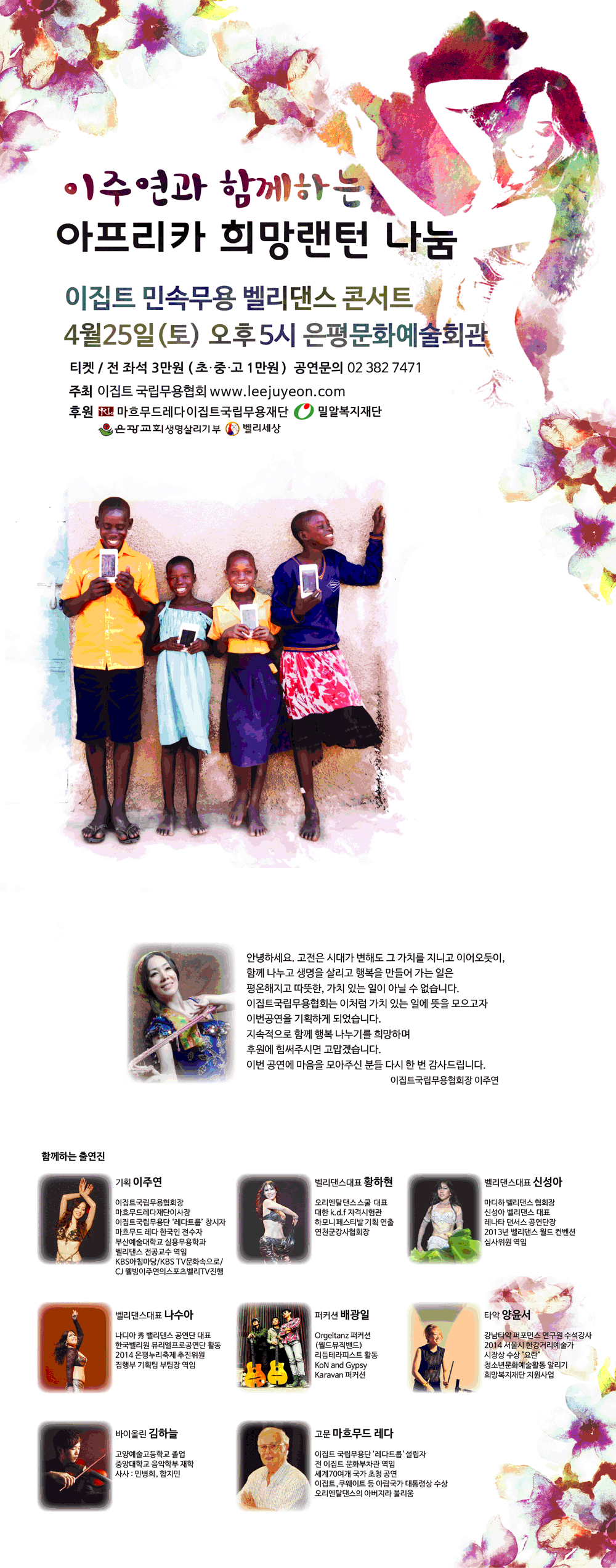이집트 국립무용협회 이주연협회장이 개최하는 이집트 민속무용 벨리댄스 콘서트에 밀알복지재단이 함께하게 되었습니다. 공연을 통해 발생된 수익금은 아프리카에 태양광 랜턴을 보내는 '라이팅칠드런' 캠페인에 기부될 예정입니다. 밀알복지재단 회원님들께는 특별할인이 제공되오니 많은 관심과 참여를 부탁드립니다.