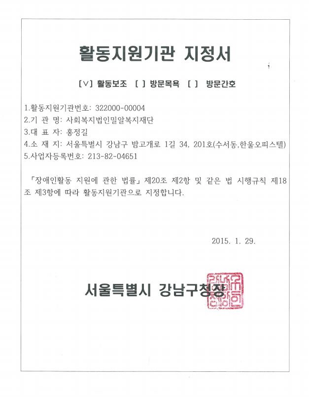 밀알복지재단은 지난 1월 29일자로 강남구청으로부터 장애인활동지원(활동보조) 기관으로 선정되었습니다.