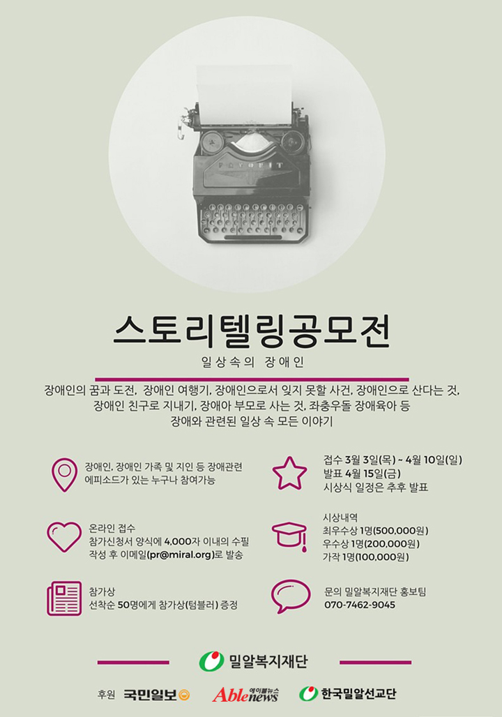 - 당선작의 저작권 등 일체 권한은 밀알복지재단에 귀속되며, 당선작품은 감성 홍보물, 영상 등으로 제작 활용될 예정임.