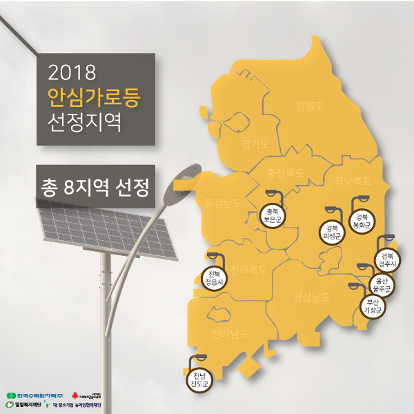밀알복지재단에서는 한국수력원자력(주) 후원, 사회복지공동모금회, 대-중소기업 농어업협력재단 지원으로 방범 취약지역 주민의 안전보호를 위한 2018년 ‘안심가로등(태양광)’ 지원사업을 수행하고 있으며, 2018 안심가로등 지원사업 사업지역이 선정되어 아래와 같이 발표 합니다.