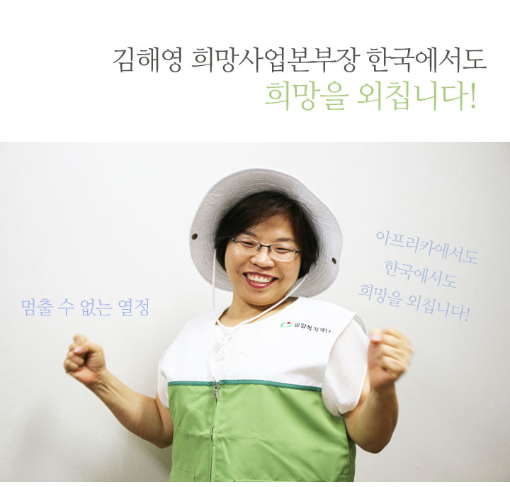 밀알복지재단 희망사업본부장으로 아프리카 케냐에서 활동중인 키 134cm의 작은 거인 김해영본부장이 7월 11일(목) 한국에 입국하여 활발한 활동을 펼치고 있다. 김본부장은 그간 밀알복지재단 희망사업본부장으로 활동하면서 진행됐던 다양한 일들과 경험담을 통해 아프리카의 현실과 빈곤지역을 위해 힘써야 할 일들을 알리는데 바쁜 일정을 보내고 있다.