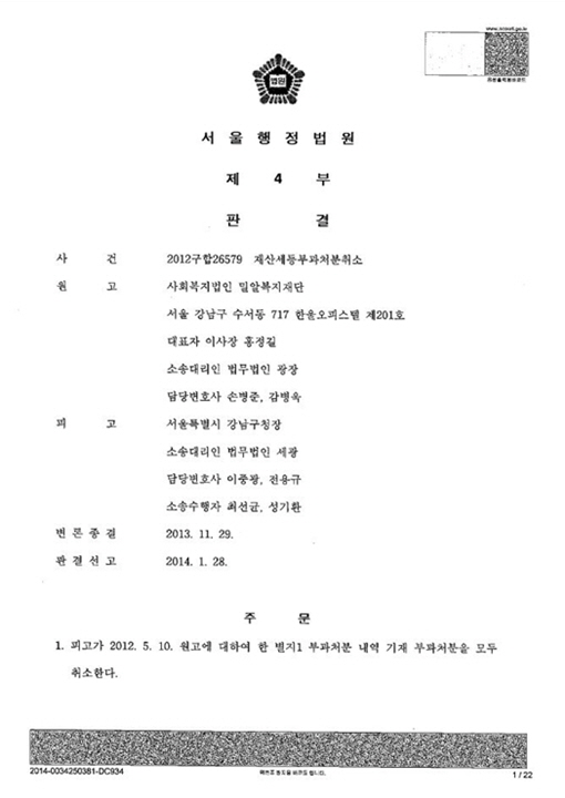 우리재단 밀알아트센터 사업과 관련하여 고유목적사업이 아닌 수익사업으로 보고 재산세를 부과한 조세당국의 처분을 취소하는 법원 판결이 나왔습니다. 서울행정법원은 “2012510일 재산세 관련 부과한 처분 내역 모두 취소한다5일 판결했습니다. 재판부는 미술관의 경우 밀알복지재단 산하 밀알학교 학생들의 교육 목적으로 이용되고 있을 뿐만 아니라 지역주민들에게도 전시회가 무상 제공됐다면서 음악당에서도 장애인과 비장애인이 함께 할 수 있는 공연을 기획해 장애인에 대한 편견을 허물 수 있도록 했다며 밀알아트센터가 설립목적에 맞게 운영됐다고 설명했습니다.