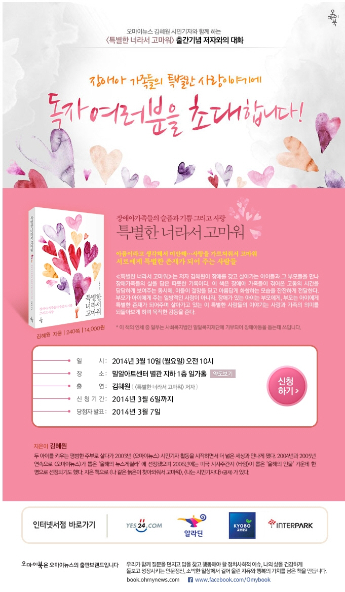 3월 10일 월요일 오전 10시 밀알아트센터 별관 지하 1층 일가홀에서 <특별한 너라서 고마워> 출간기념 저자와의 대화 시간을 가지며, 신청은 3월 6일까지 받고 있다.