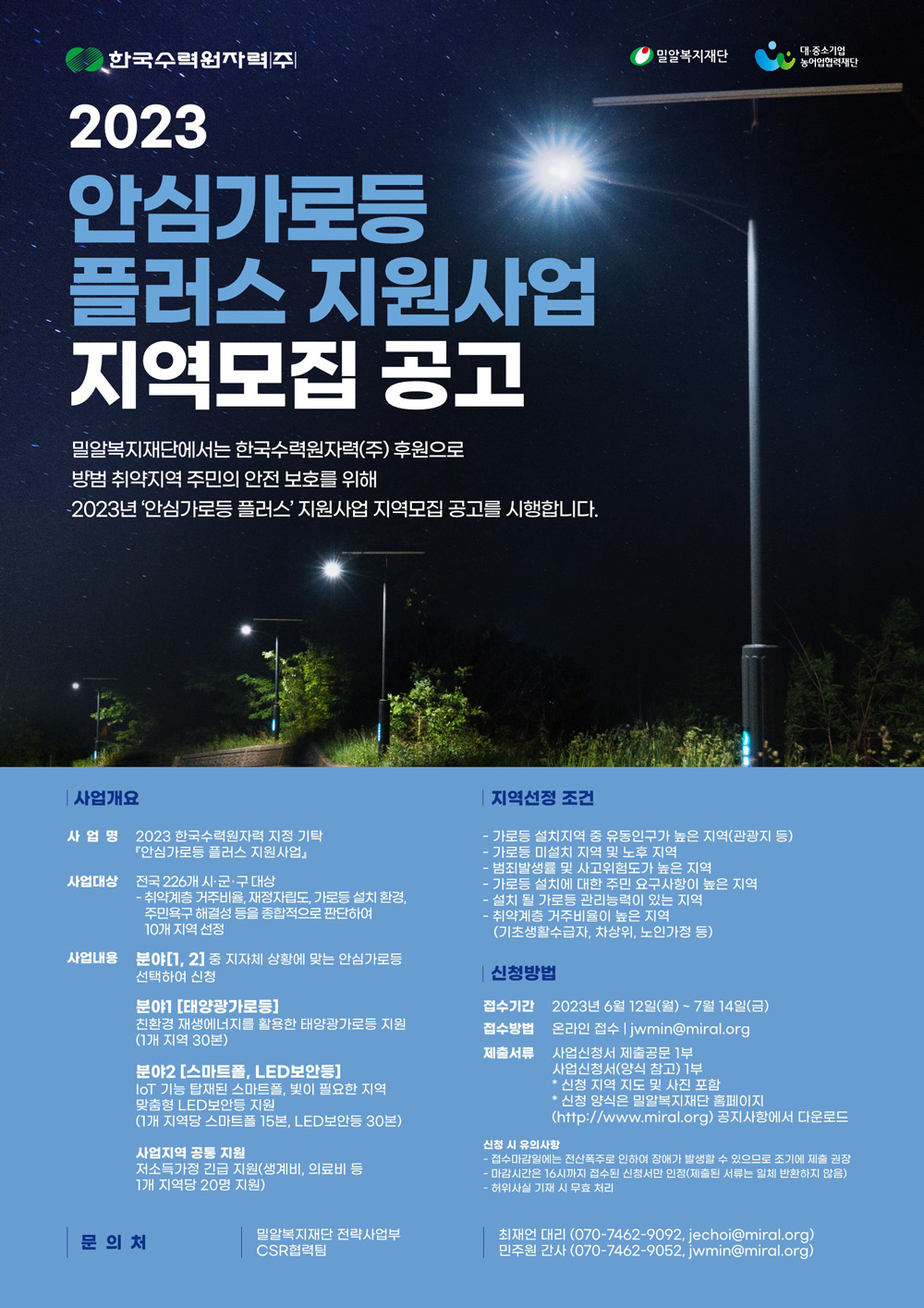 [마감] 2023 한국수력원자력 '안심가로등 플러스 지원사업' 지역모집 공고 (~7/14)