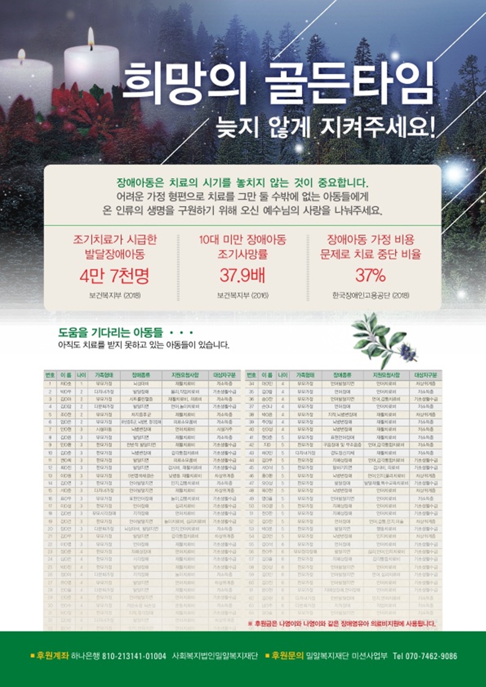 밀알복지재단(이사장 홍정길)은 한국교회와 함께 ‘늦지 않게 지켜주세요’ 캠페인을 진행해 치료가 시급한 영유아 장애아동을 돕고 있다고 15일(금) 밝혔다.