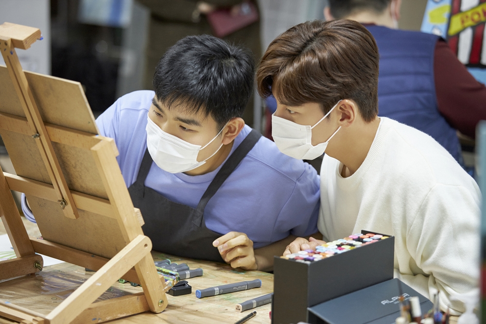 지창욱이 발달장애인 황진호 작가와 함께 그림을 그리고 있다.