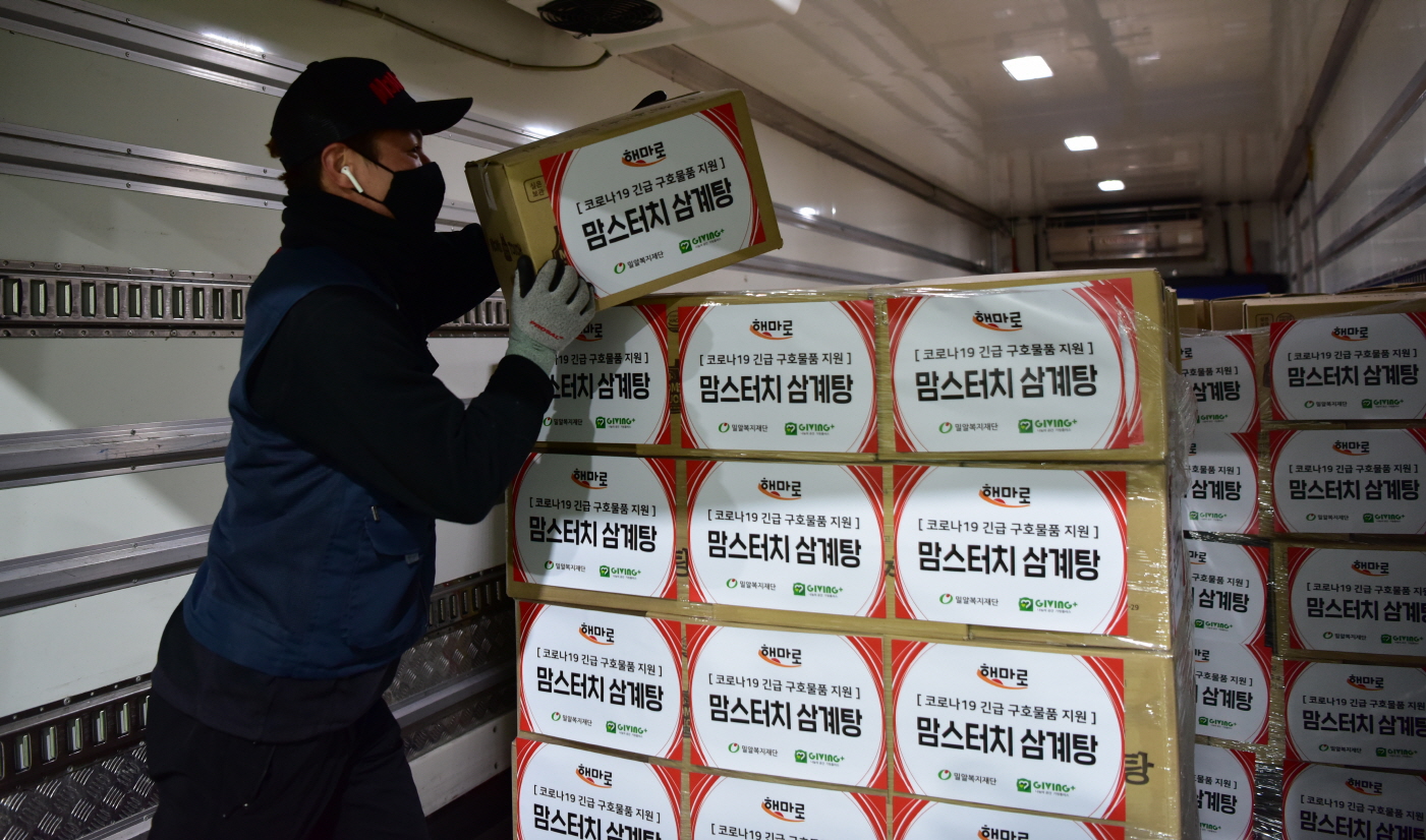 [사진1,2] 해마로푸드서비스가 코로나19 극복을 위해 밀알복지재단에 삼계탕 4만5천개를 기부했다.