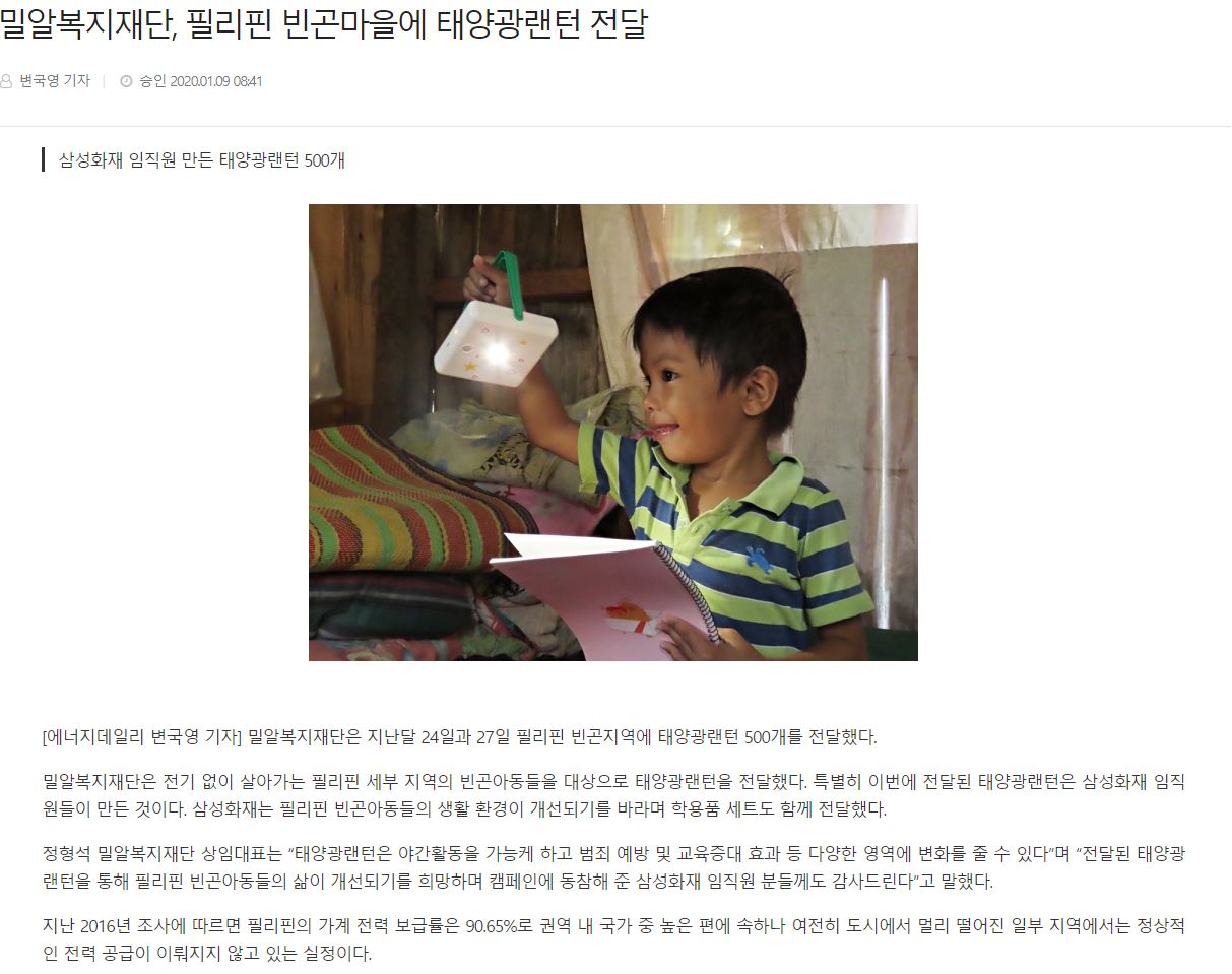 [에너지데일리] 밀알복지재단, 필리핀 빈곤마을에 태양광랜턴 전달