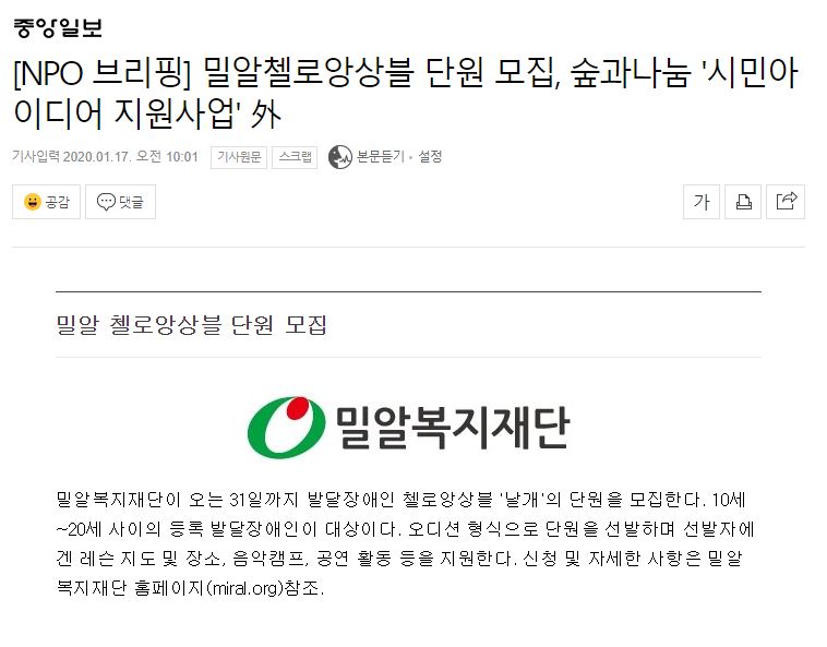 [중앙일보] [NPO 브리핑] 밀알첼로앙상블 단원 모집, 숲과나눔 '시민아이디어 지원사업' 外