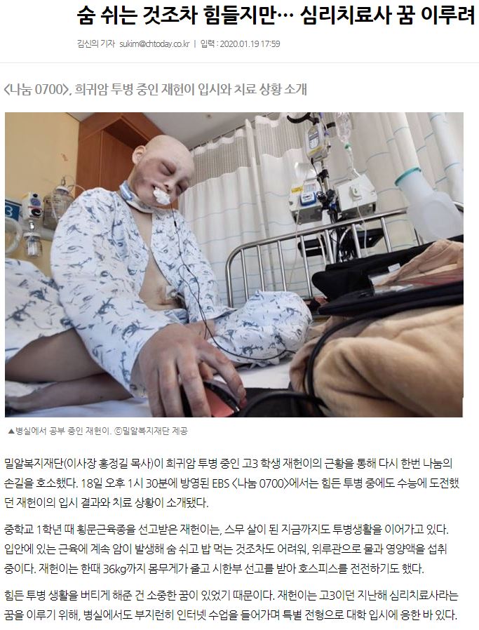 [크리스천투데이 외] 숨 쉬는 것조차 힘들지만… 심리치료사 꿈 이루려 <나눔 0700>, 희귀암 투병 중인 재헌이 입시와 치료 상황 소개