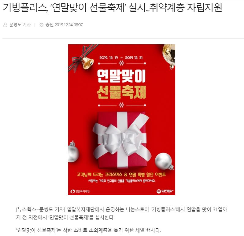 [뉴스웍스] 기빙플러스, ‘연말맞이 선물축제’ 실시...취약계층 자립지원
