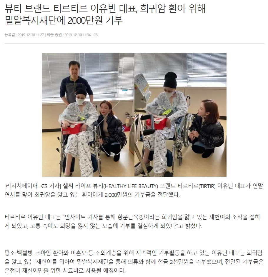 [리서치페이퍼] 뷰티 브랜드 티르티르 이유빈 대표, 희귀암 환아 위해 밀알복지재단에 2000만원 기부