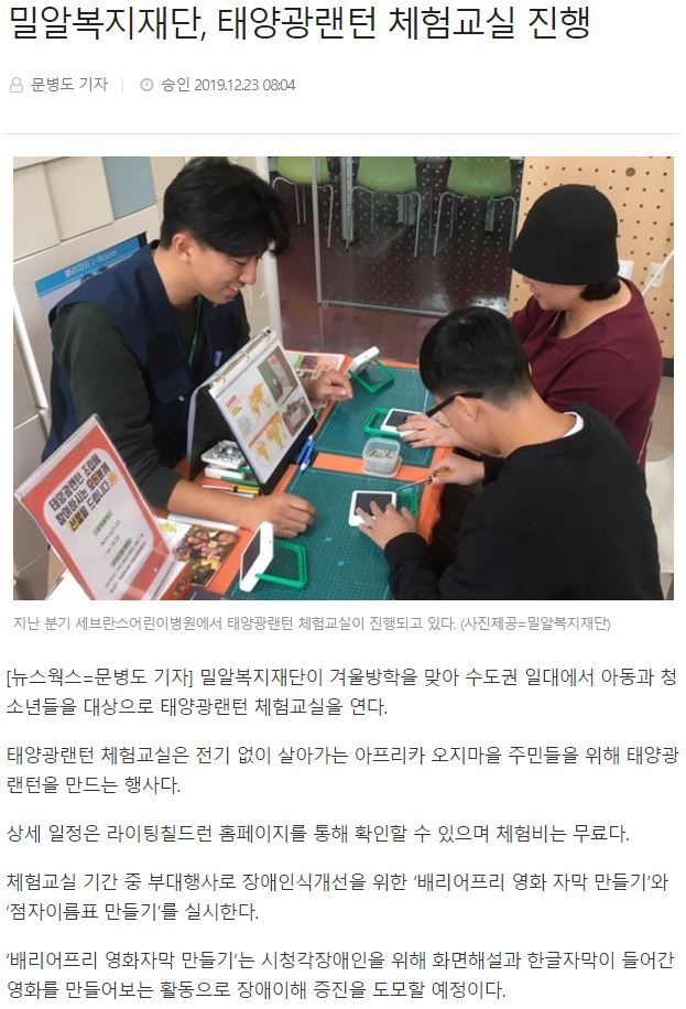 [이슈와뉴스] 밀알복지재단, 겨울방학 맞아 태양광랜턴 체험교실 진행