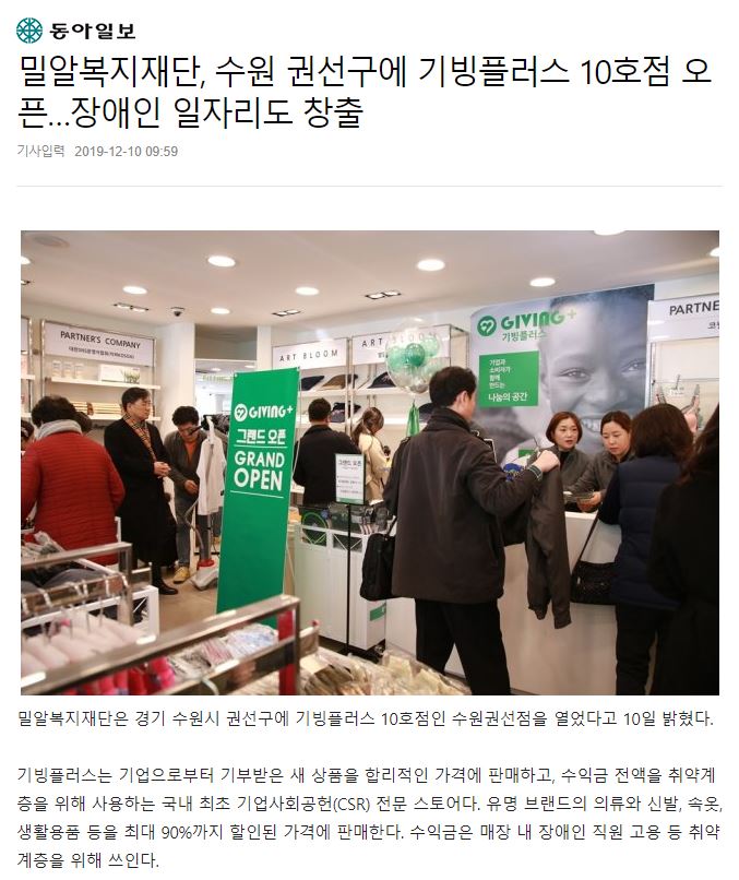 [동아일보] 밀알복지재단, 수원 권선구에 기빙플러스 10호점 오픈…장애인 일자리도 창출