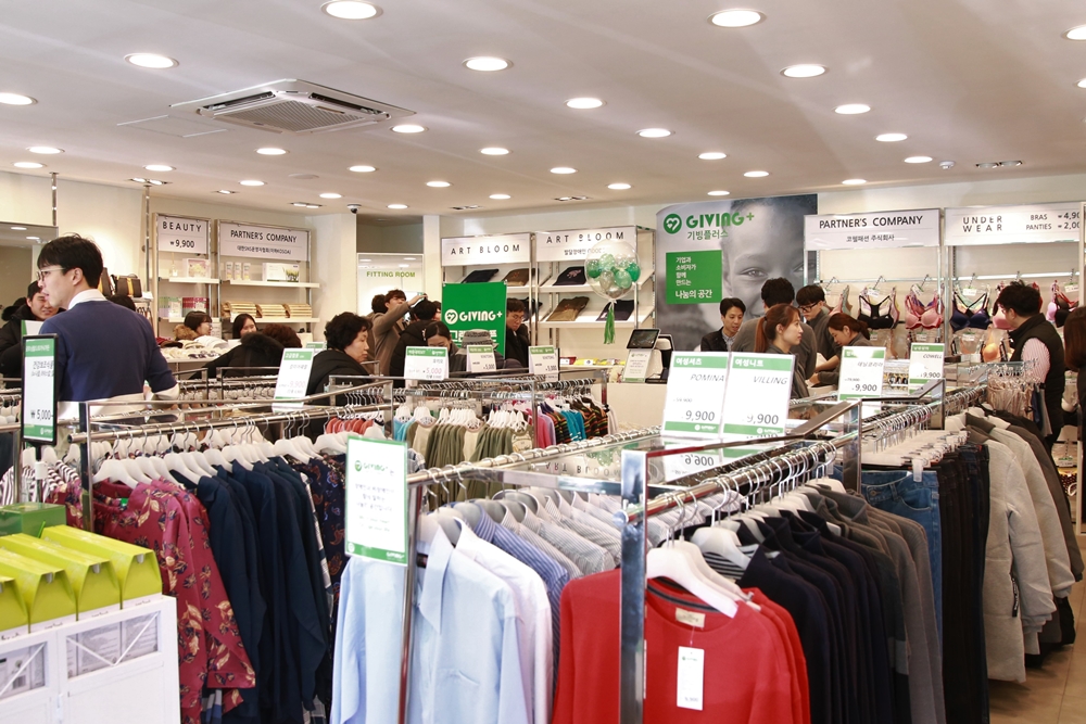 기빙플러스(givingplus.co.kr)는 기업으로부터 기부받은 새상품을 합리적인 가격에 판매하고, 수익금 전액을 취약계층을 위해 사용하는 국내 최초 기업사회공헌(CSR) 전문 스토어다. 유명브랜드의 의류와 신발, 속옷, 생활용품 등을 최대 90%까지 할인된 가격에 판매한다. 수익금은 매장 내 장애인 직원 고용 등 취약계층을 위해 쓰인다.