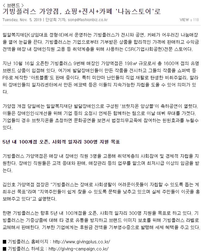 [패션비즈] 기빙플러스 가양점, 쇼핑+전시+카페 '나눔스토어'로