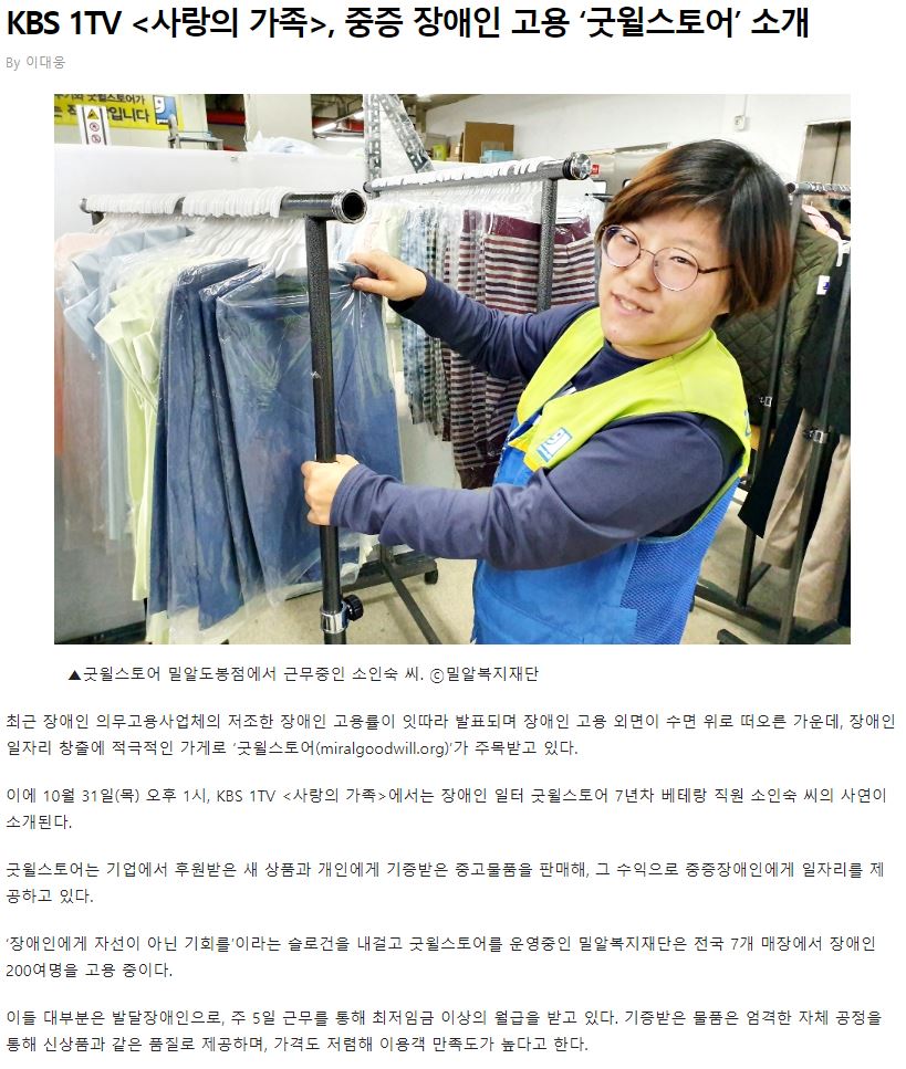 [기독인뉴스] 밀알복지재단 굿윌스토어 KBS1TV 사랑의가족서 방영