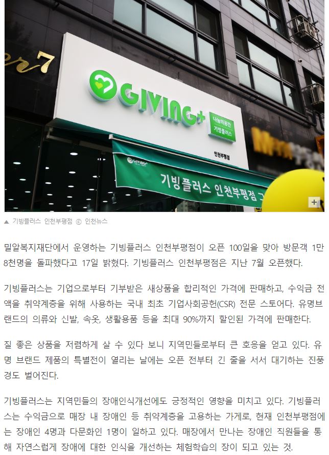 [인천뉴스] 기빙플러스 인천부평점, 오픈 100일 방문객 1만8천명 돌파