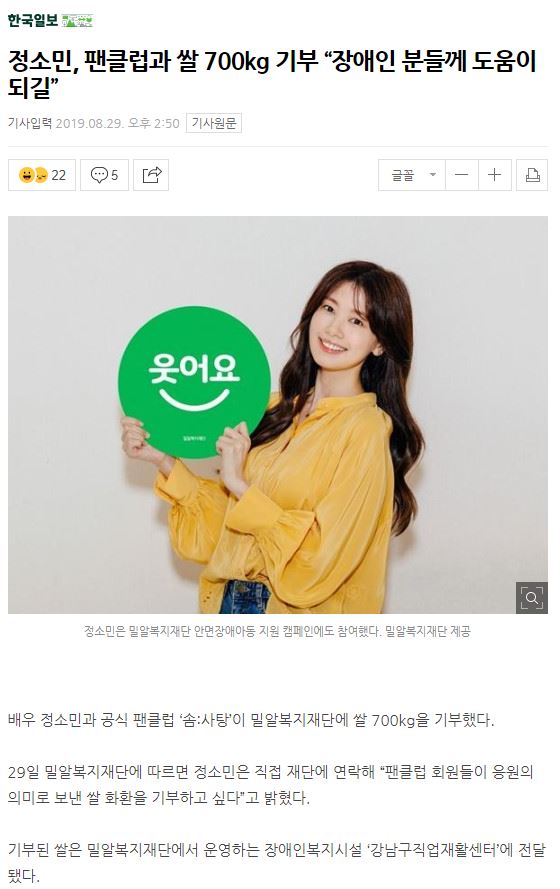 [한국일보] 정소민, 팬클럽과 쌀 700kg 기부 “장애인 분들께 도움이 되길”