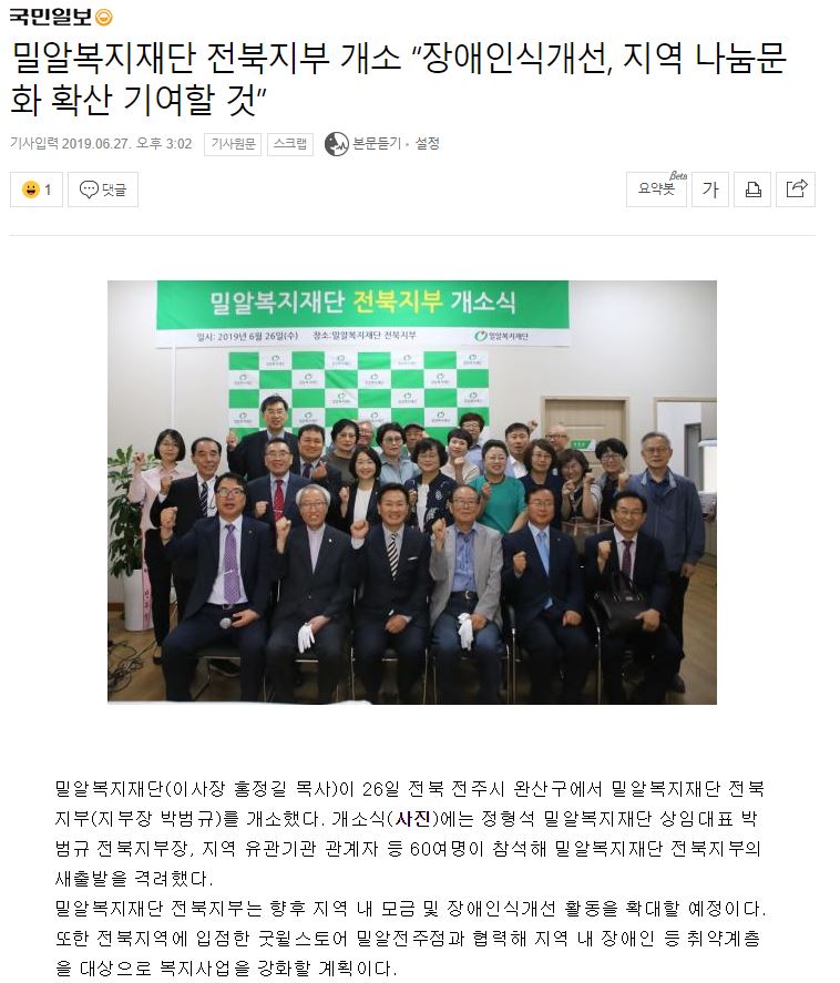 [국민일보] 밀알복지재단 전북지부 개소 “장애인식개선, 지역 나눔문화 확산 기여할 것”