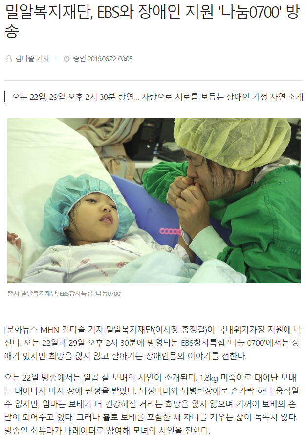 [문화뉴스 외] 밀알복지재단, EBS와 장애인 지원 '나눔0700' 방송