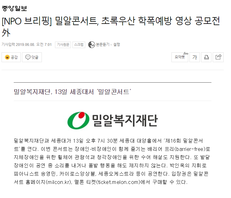 [중앙일보] [NPO 브리핑] 밀알콘서트, 초록우산 학폭예방 영상 공모전 外