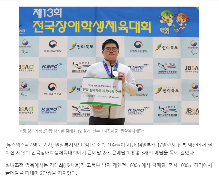 [뉴스웍스] 밀알복지재단 후원 청소년들, 제13회 장애학생체전에서 메달 3개 석권