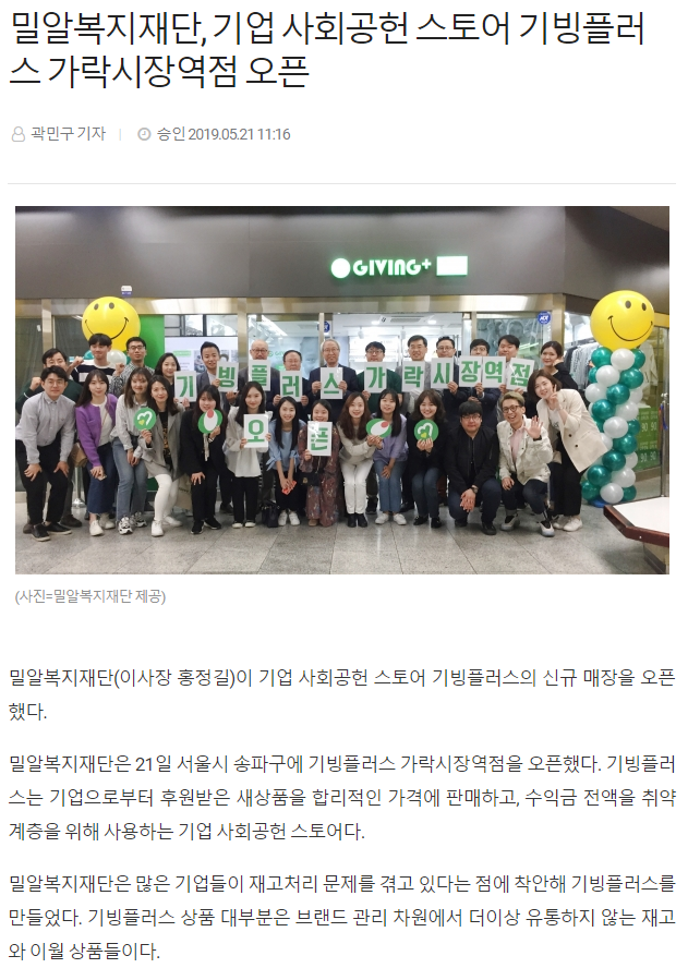 [뷰어스] 밀알복지재단, 기업 사회공헌 스토어 기빙플러스 가락시장역점 오픈