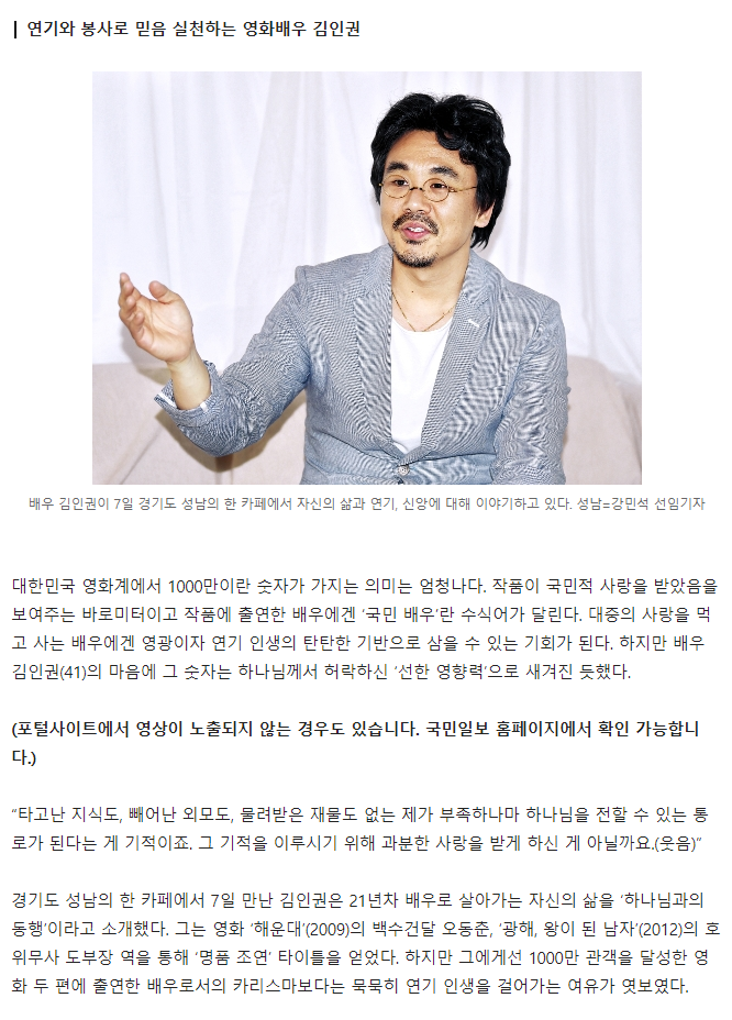 [국민일보] [나와 예수-김인권] “21년 배우 인생은 주님과의 동행 ‘기적’ 이루는 과분한 사랑 주셨죠”